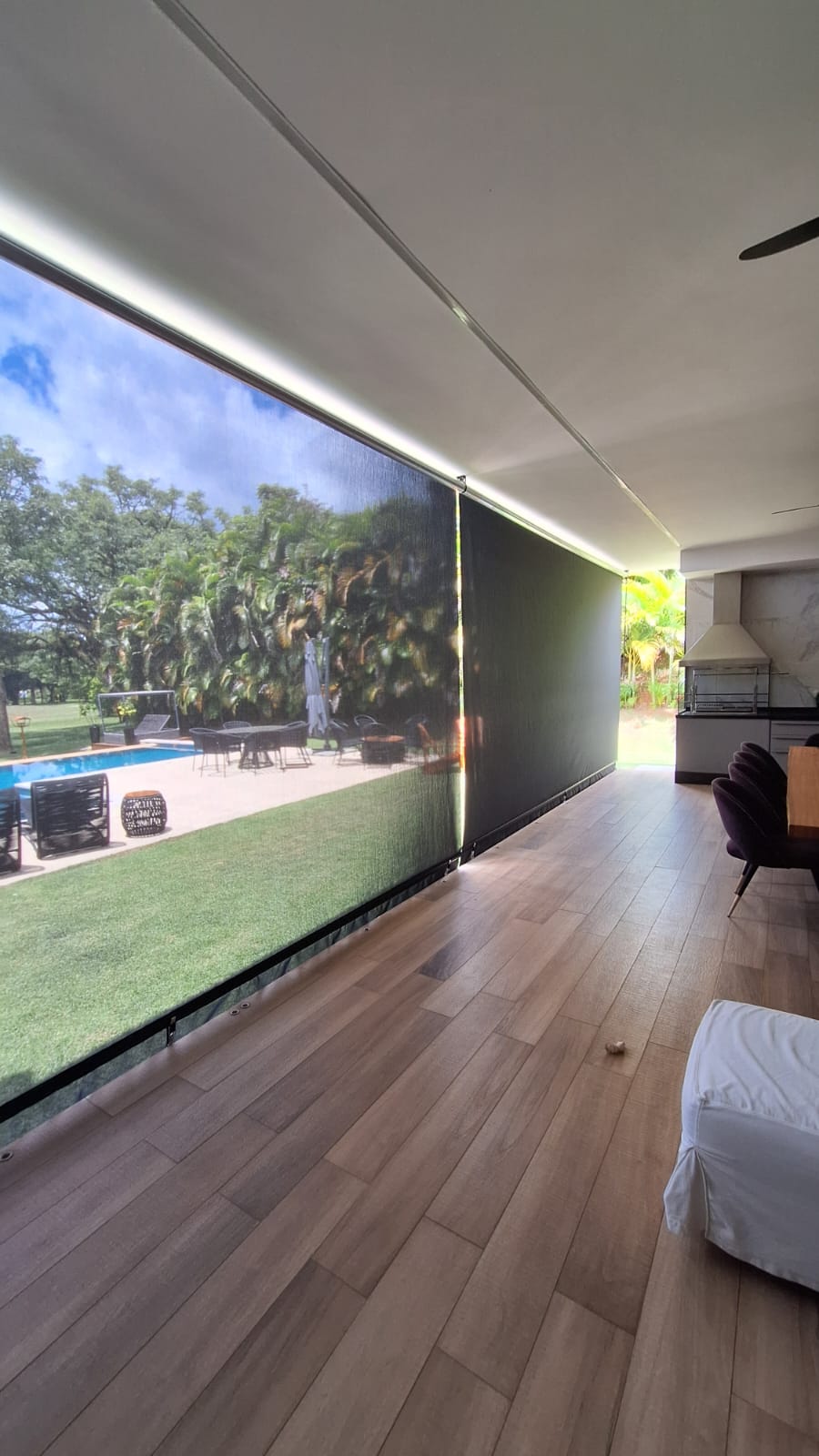 Ideal para varandas, áreas gourmet e piscinas. Estrutura em alumínio com motorização e automação residencial.